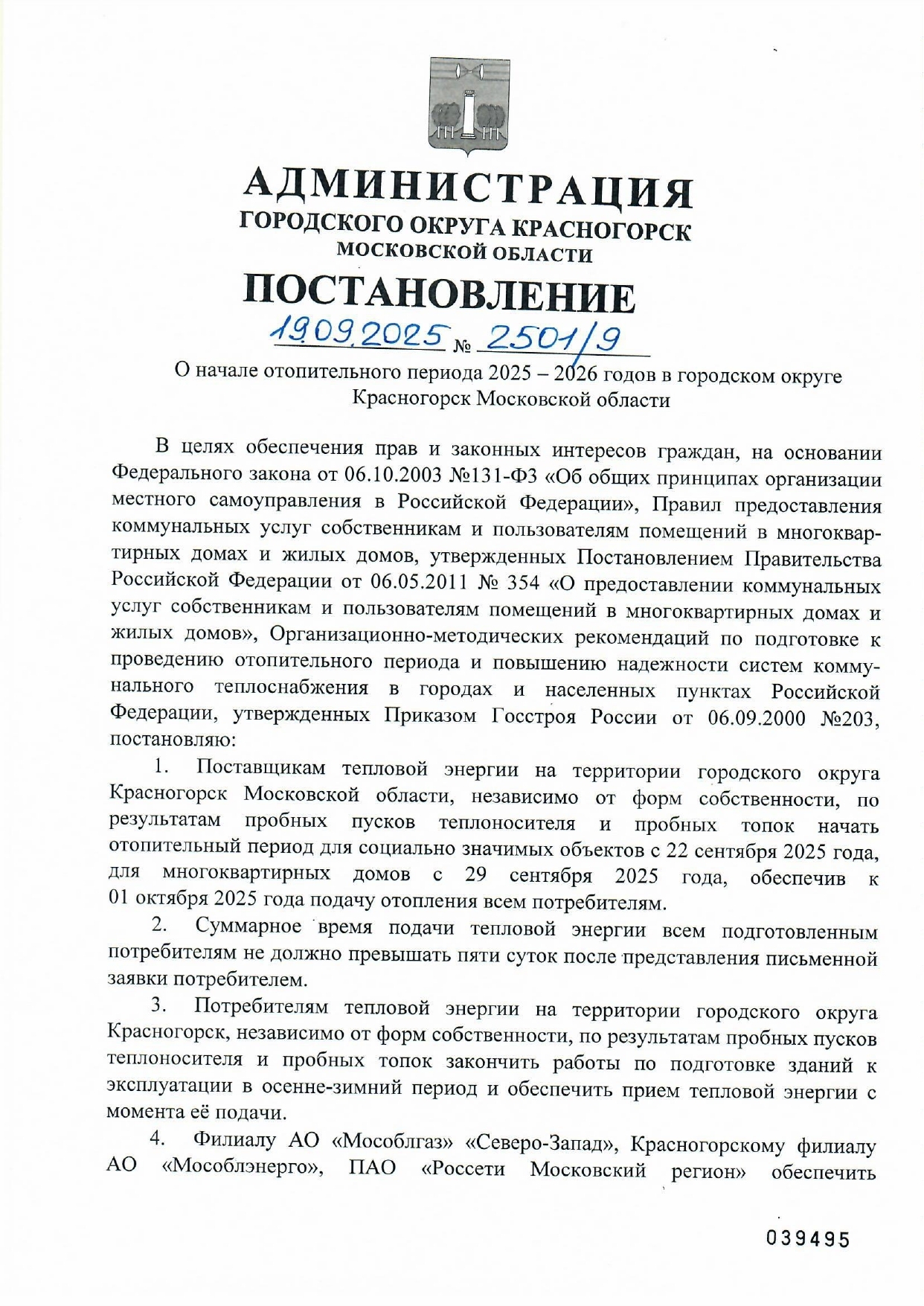 Постановление о начале отопительного сезона периода 2025-2026 г.